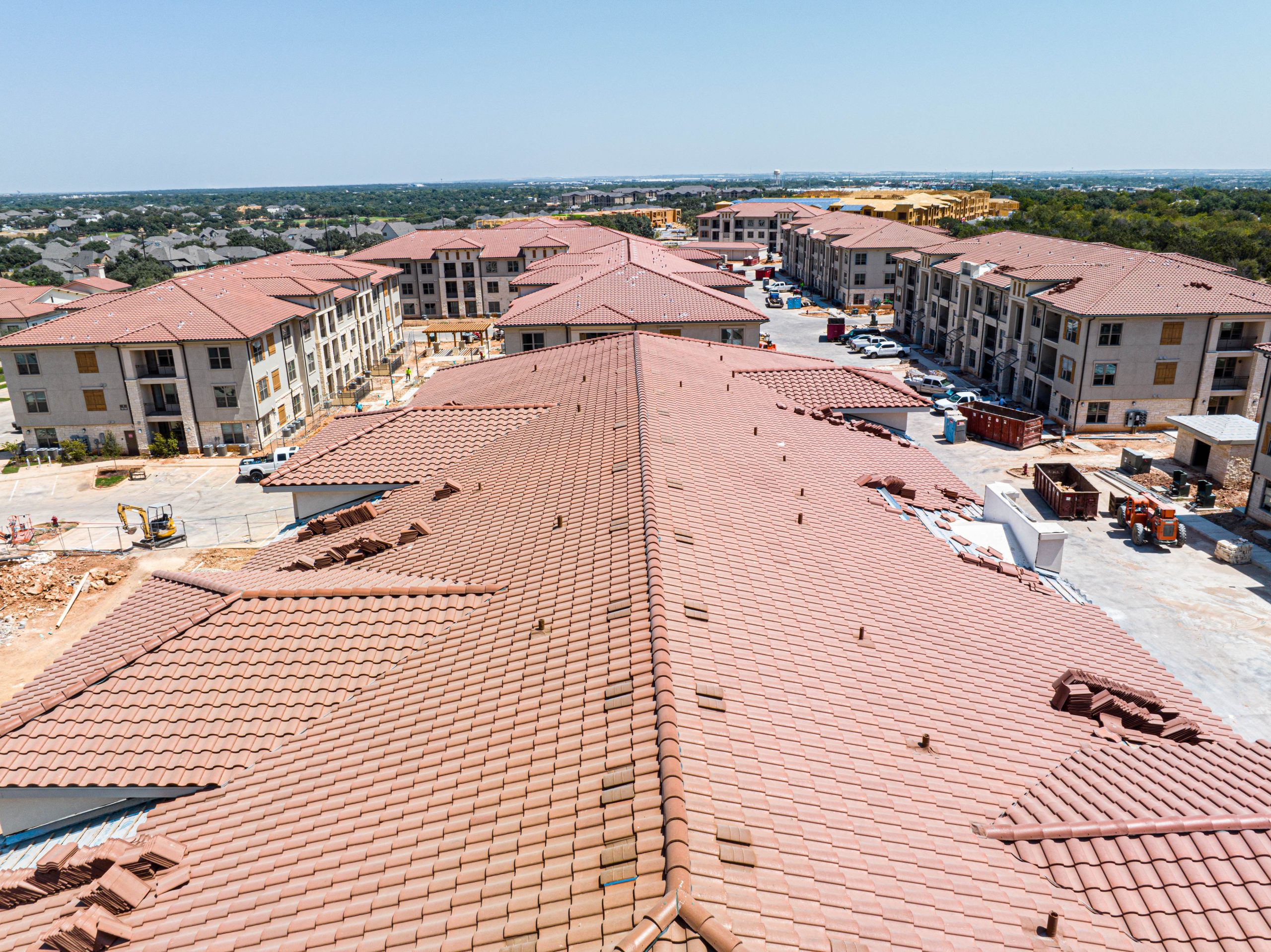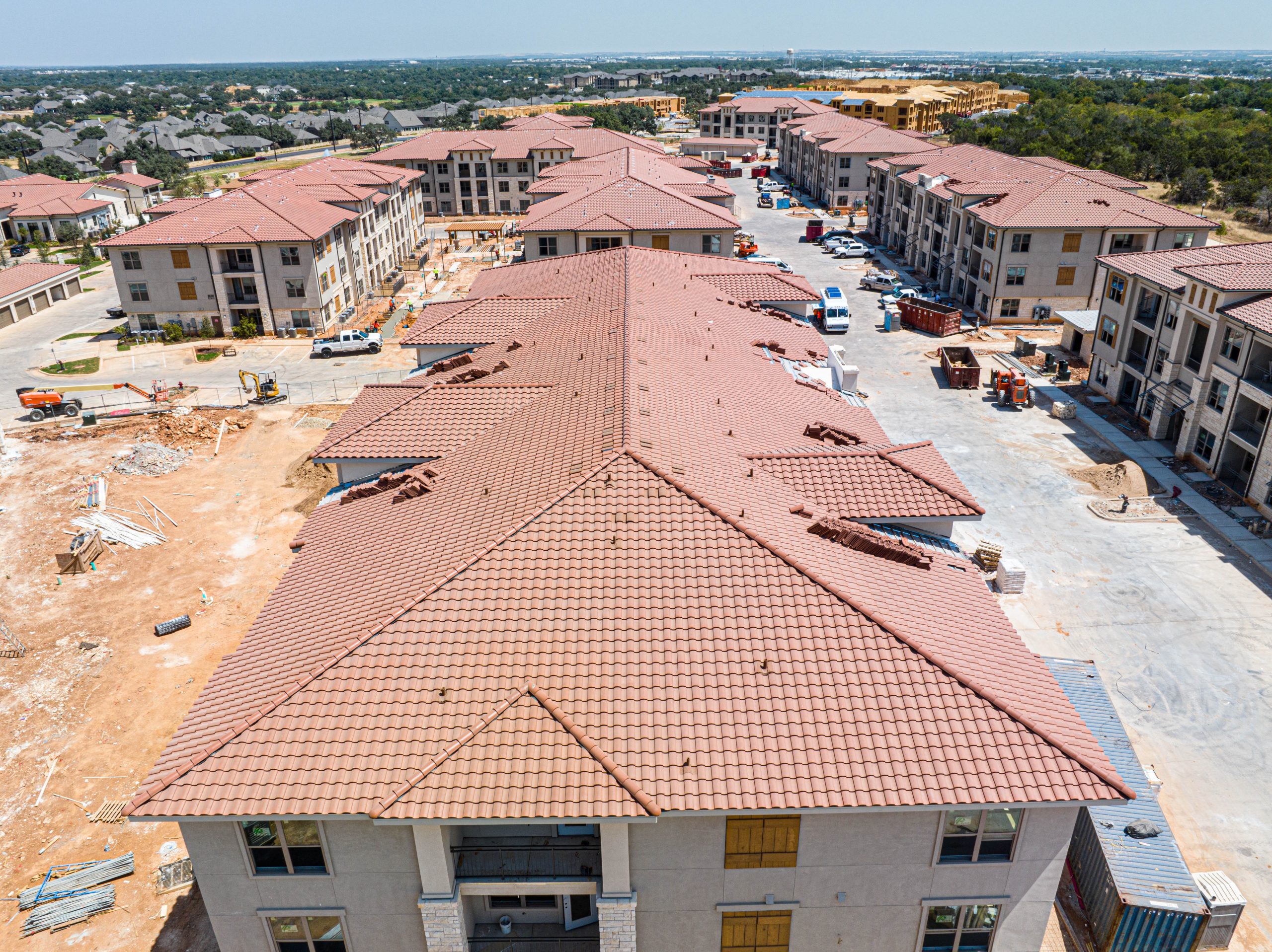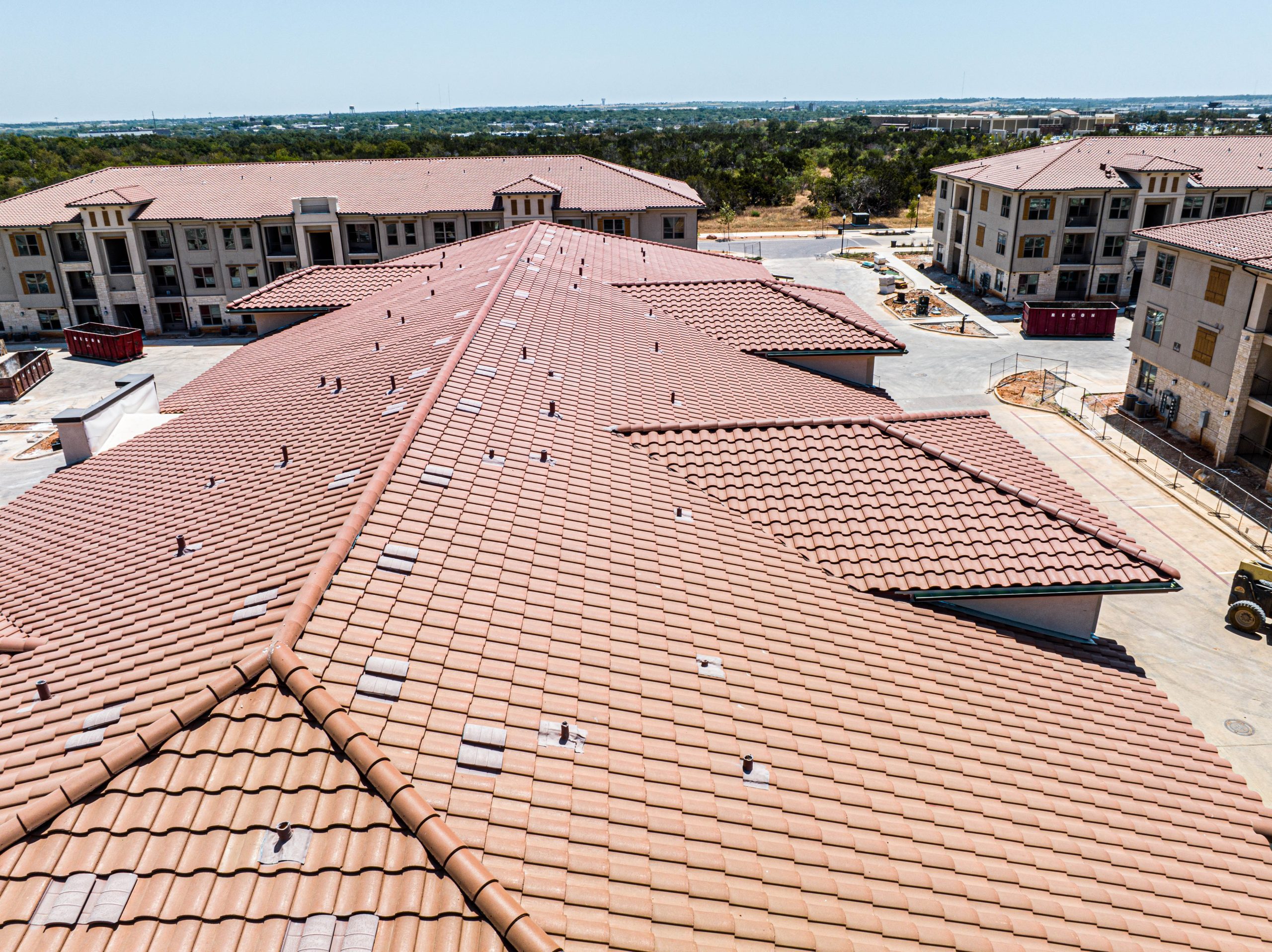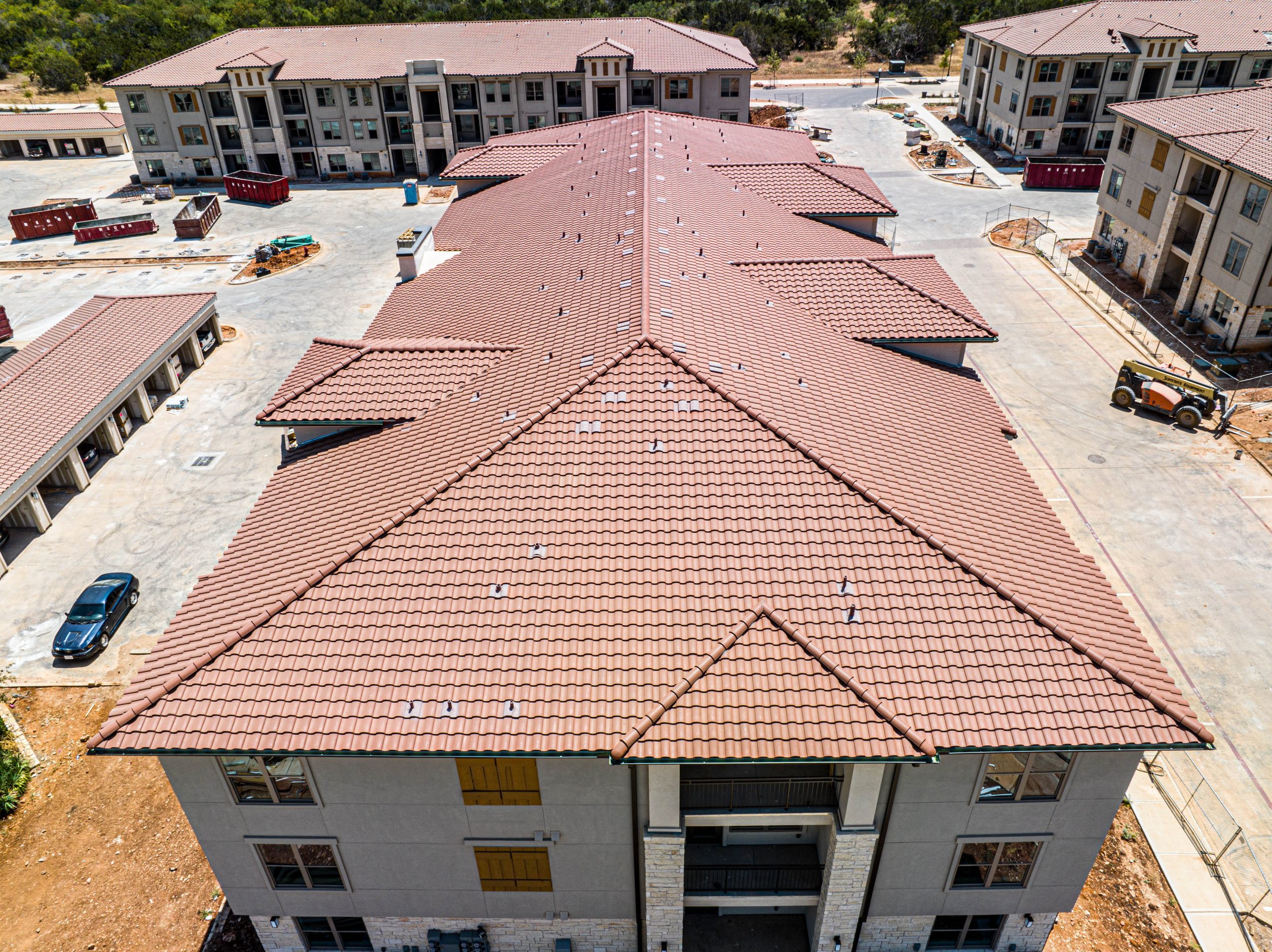 This new construction multi-family complex was completed with concrete Spanish Barrel Tile. The project consisted of roofing 12+ residential centers in the tile as well as some small roof overhangs and a pet shelter in metal. Paradigm Roof+Shield was awarded the NTRCA’s Golden Hammer for this project, which clearly showcases their ability to operate throughout the state of Texas with a high level of craftsmanship.